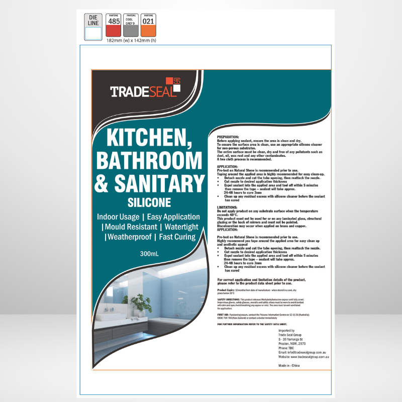 Tradeseal Kitchen, Bathroom & Sanitary Silicone is an anti-fungal, non-diluted, high performance, UV-resistant neutral cure 100% silicone sealant. It is designed to be used in all aspects of aesthetic detailing; in particular, sealing joints or seams in ceramics, tile, plaster, metal and timber (natural or painted) in wet areas, food preparation areas and cool rooms. Conforms to AS/NZS4020
